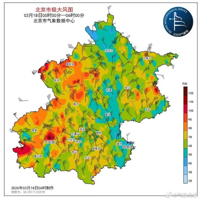 北京市气象台18日6时发布,今天白天晴,北转南风三级左右,阵风六七级,最高气温13℃;夜间晴间多云,南转北风一二级,最低气温0℃。目前本市正处于大风蓝色预警中,预计今天早晨至上午大风持续,中午前后有所减弱,下午仍有3级左右偏南风,夜间风力减弱至1—2级。